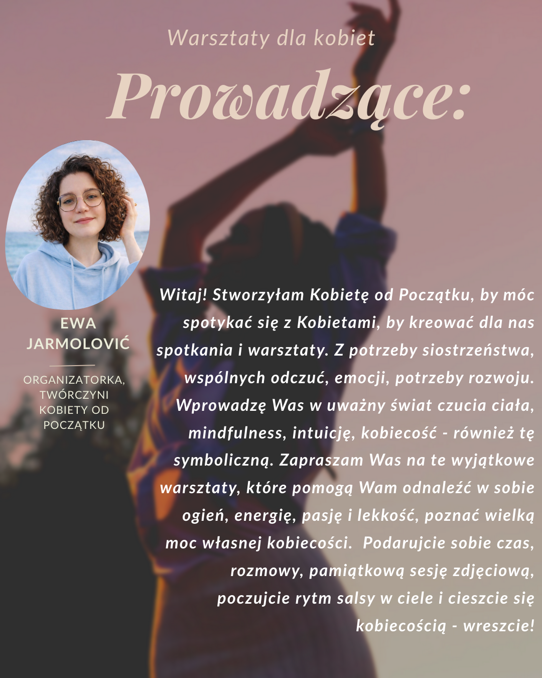 Zapraszam Cię na absolutnie unikatowe, całodniowe warsztaty dla kobiet, które łączą w sobie mindfulness, ognistą salsę i sesję zdjęciową wraz z warsztatem z fotografką o pozowaniu.