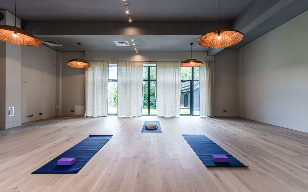 Wspólna Przestrzeń: Na Gości czeka duża, wspólna przestrzeń z kominkiem i tarasem zewnętrznym, która idealnie sprawdzi się do wspólnej praktyki, medytacji czy wieczornych kobiecych pogaduch.